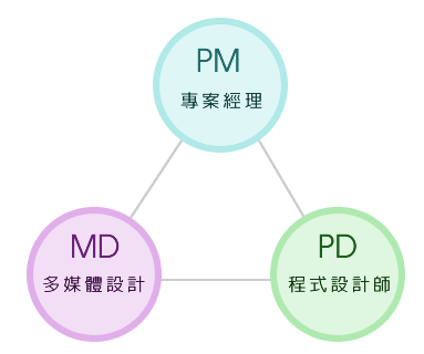 1. 專案經理(PM)對內領導多媒體設計師群(MDs)與程式設計師群(PDs)共同完成專案。