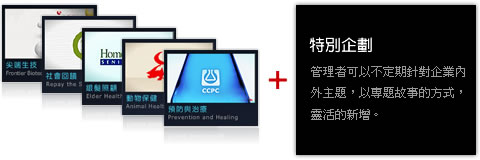 特別企劃的概念從中而生,整合了中化製藥最核心的價值、理念、願景,透過新的設計思維,大方美觀的圖片處理結合FLASH的動態展示,直接地表達中化製藥的核心價值、理念、願景,管理者可以不定期針對企業內外主題,以專題故事的方式,靈活的新增。